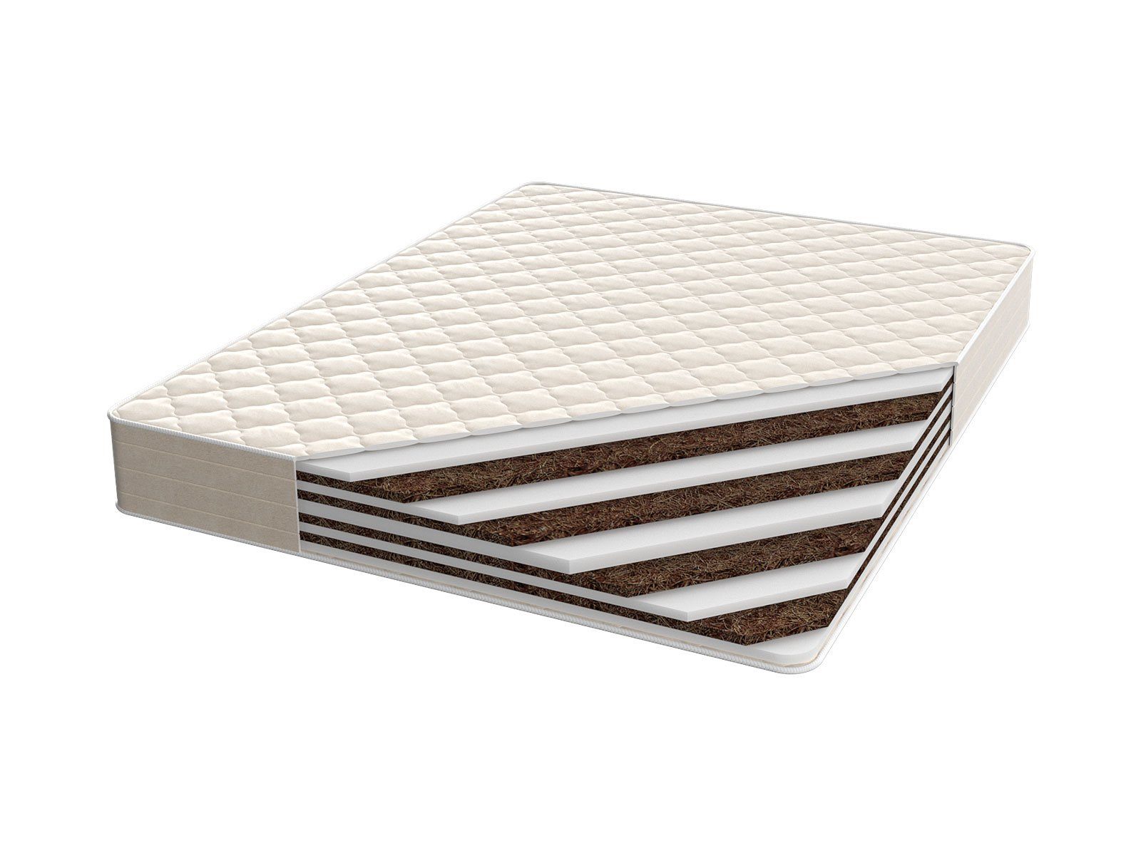 Беспружинная модель Дамис Эко выглядит как слоеный пирог: сочетание ортопены и кокосовой койры дают отменную плотность и жесткость. Беспружинные модели отличаются от пружинных именно плотностью наполнителей и статичностью всей конструкции.