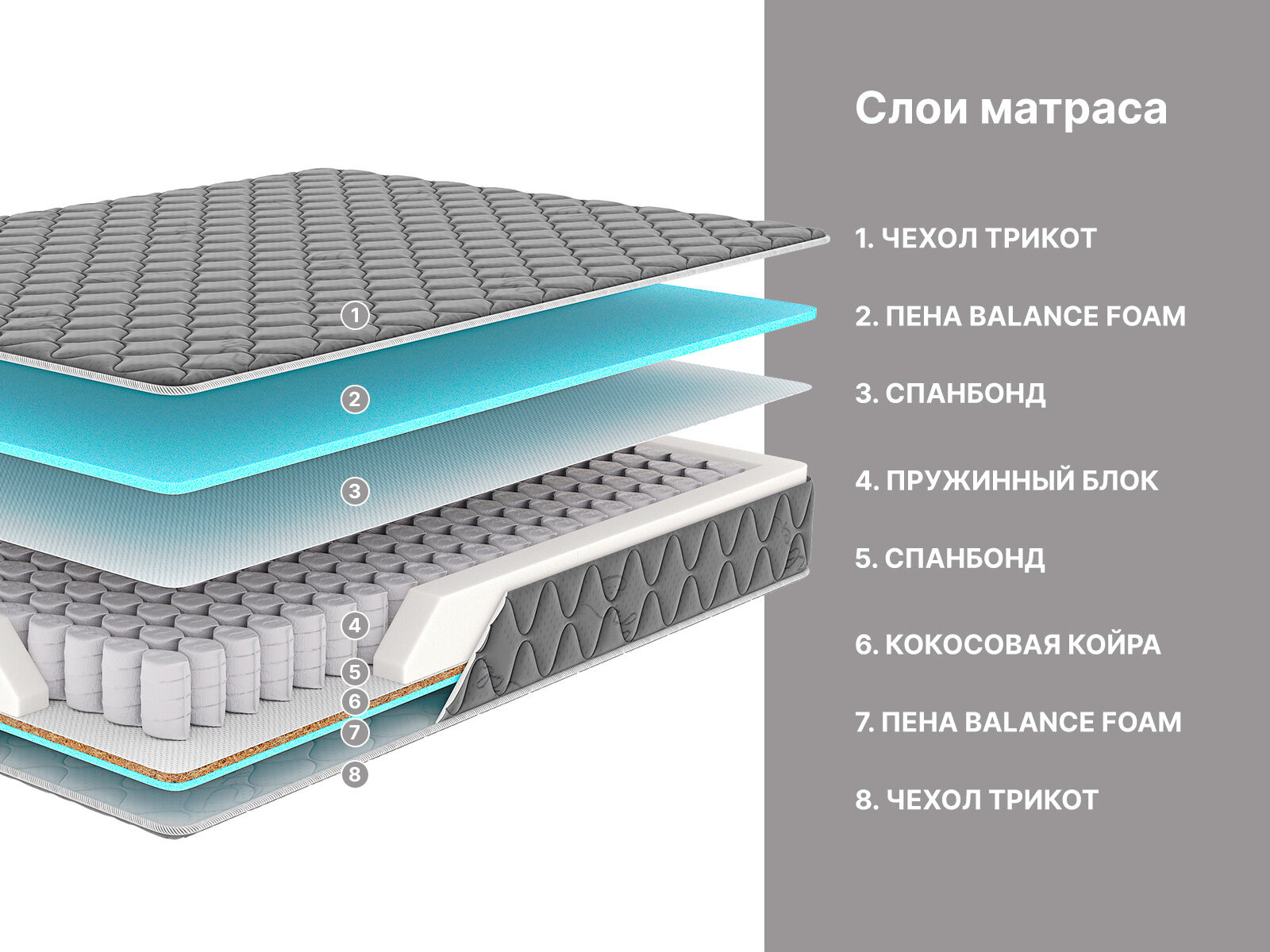 Натуральный кокосовый слой делает матрас жёстче и помогает удерживать спину в правильном положении. Кокос усиливает ортопедические качества модели.