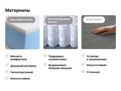 Пена Balance foam – пластичный наполнитель, который умеет адаптироваться под фигуру и её линии, создавая тем самым очень комфортное место сна.