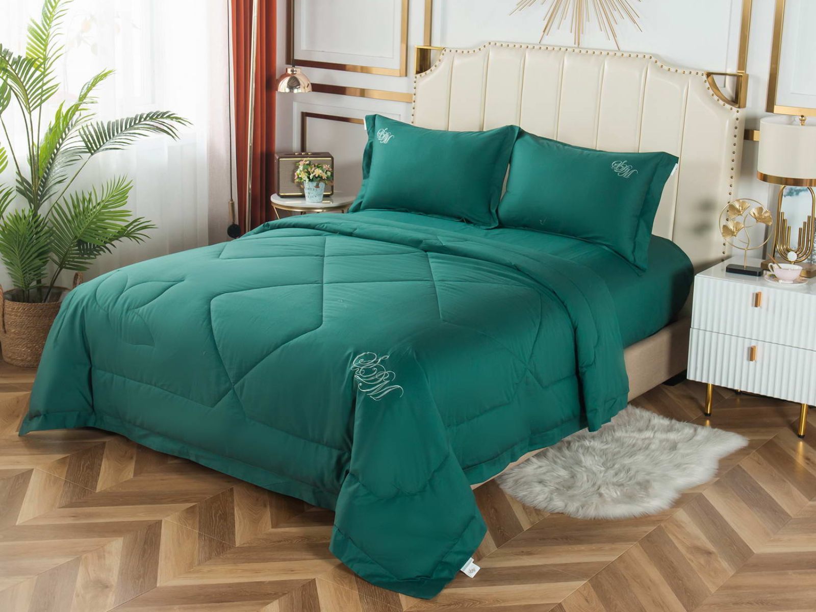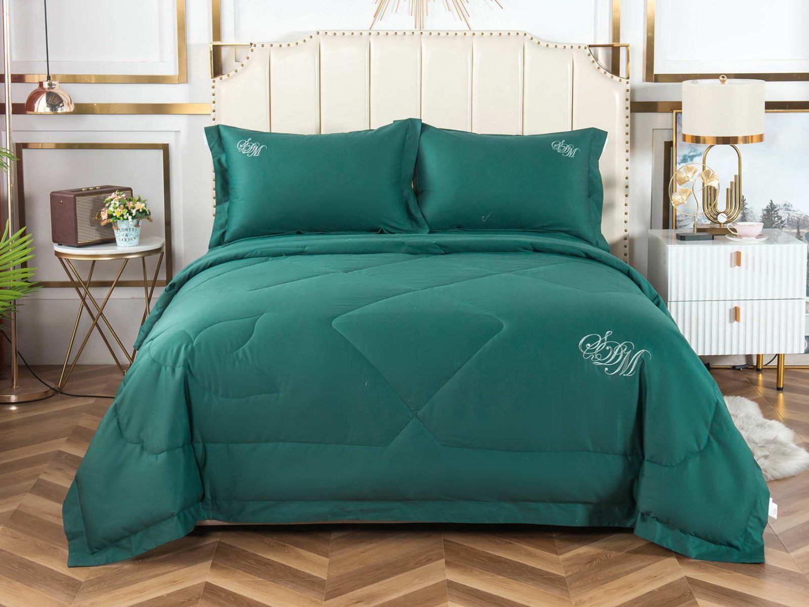 В комплект входят простыня, наволочки и одеяло. Одеяло простеганное, легкое и воздушное, его можно стирать в стиральной машине. Благодаря микроволокну в составе наполнителя для одеяла, оно всегда принимает свою начальную форму.