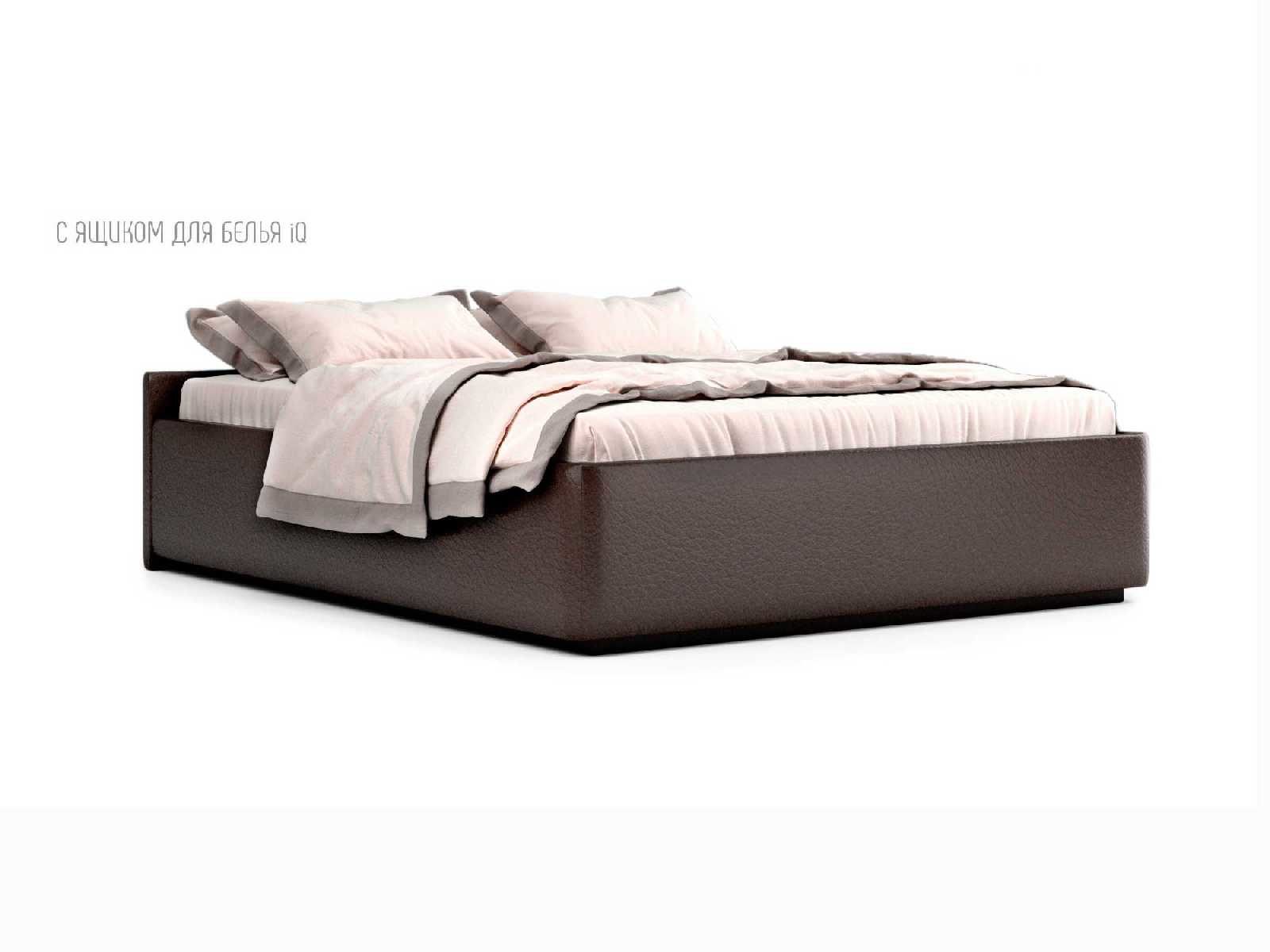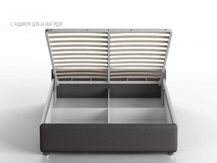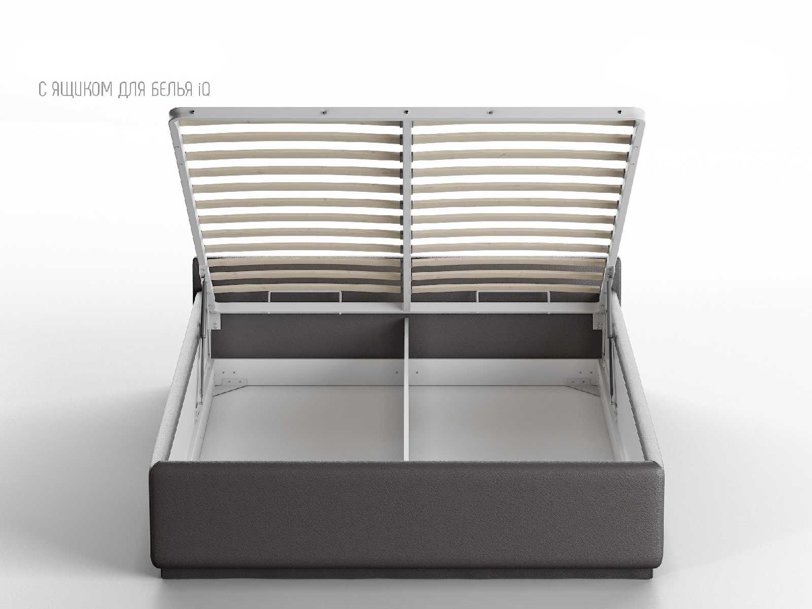 Кровать укомплектована IQ с подъемным механизмом и ящиком для белья без дна (дополнительная платная опция - дно к ящику IQ из HDF (ХДФ). Каркас кровати на цоколе, декоративный чехол на цоколе съёмный. Глубина ящика для белья - 30 см, без ограничения нагрузки на ящик.