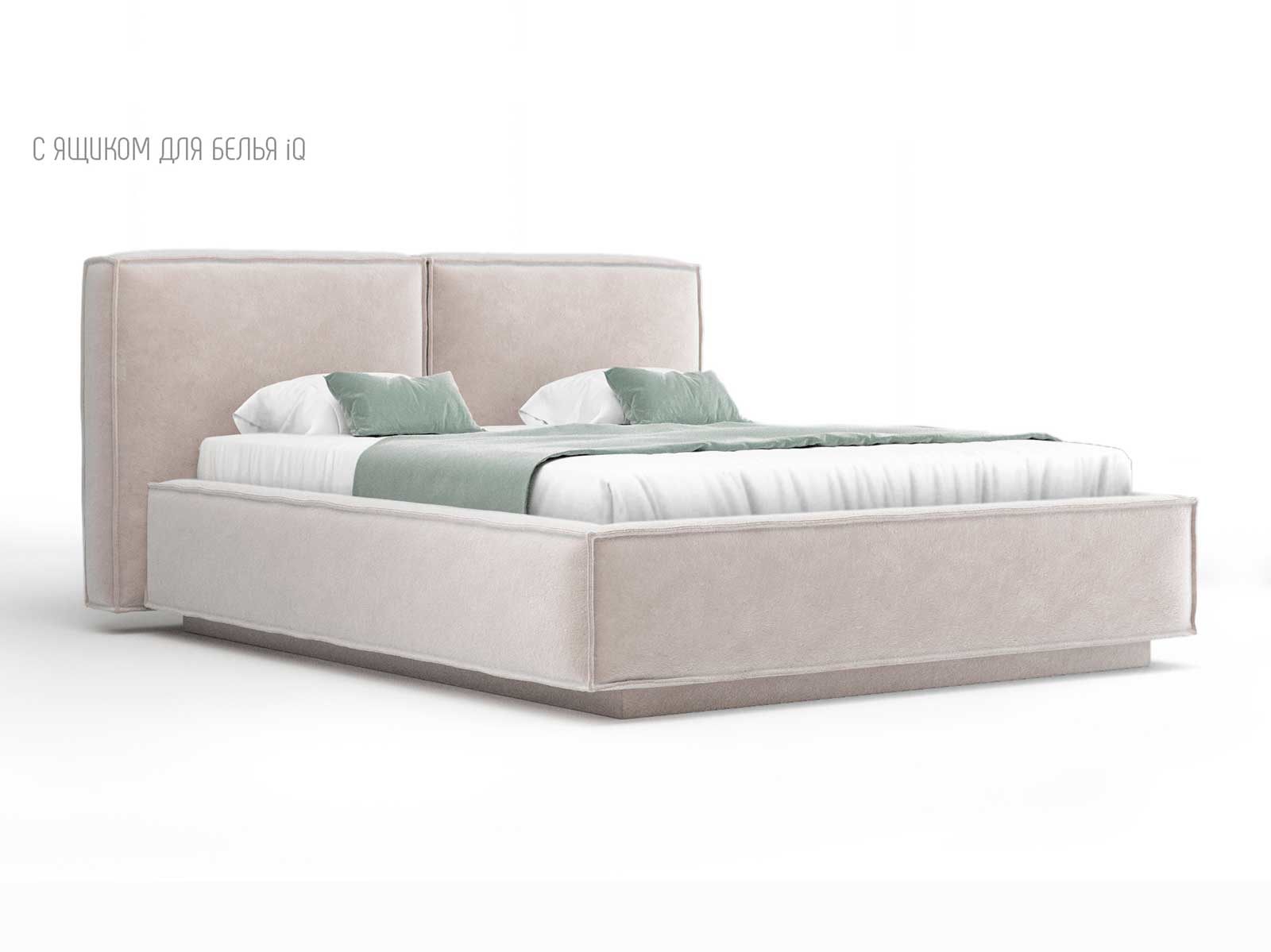 Кровать укомплектована IQ с подъемным механизмом и ящиком для белья без дна (дополнительная платная опция - дно к ящику IQ из HDF (ХДФ). Каркас кровати на цоколе, декоративный чехол на цоколе съёмный. Глубина ящика для белья - 30 см, без ограничения нагрузки на ящик.