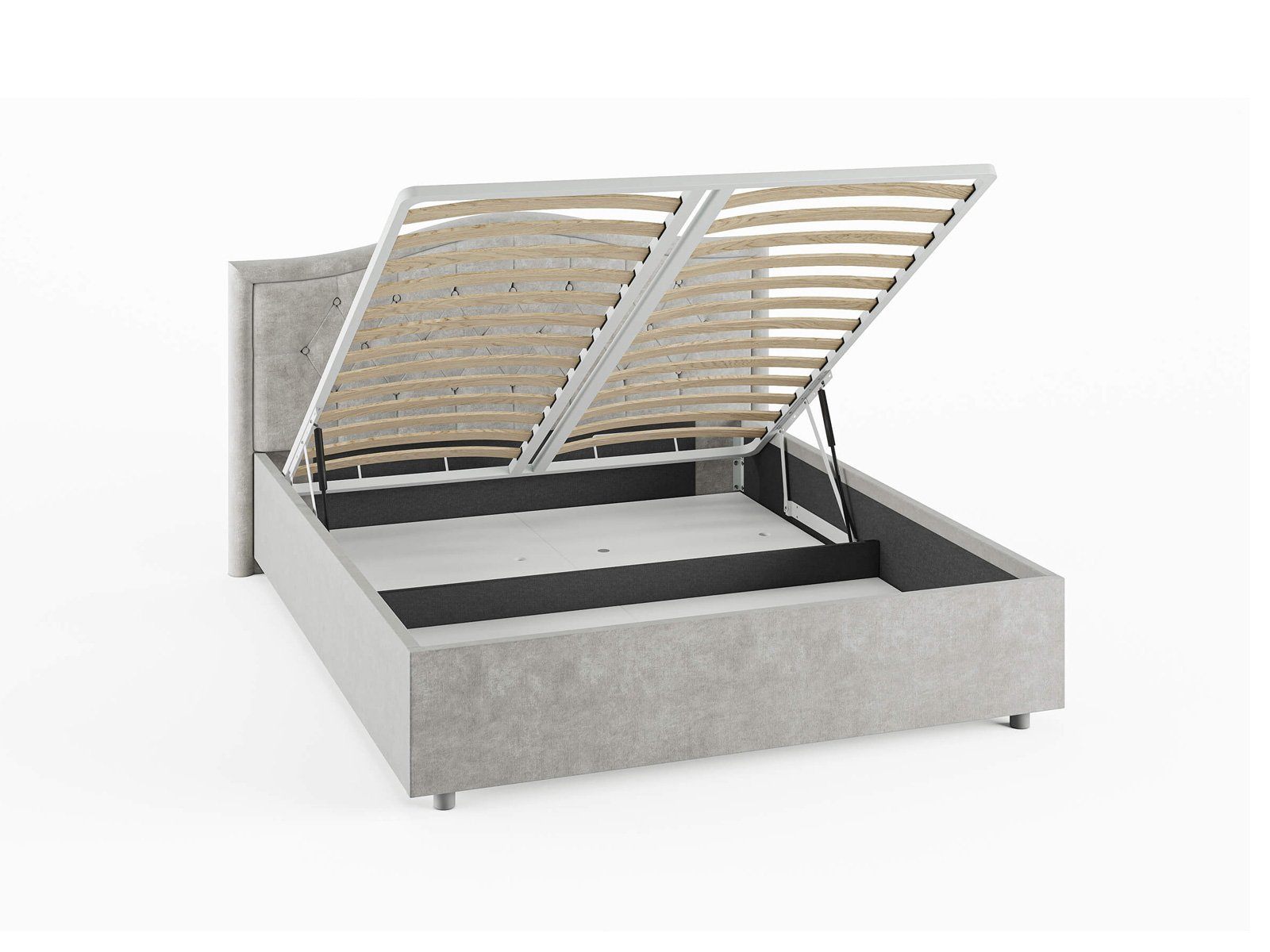 Кровать комплектуется металлическим основанием и подъемным механизмом со вместительным бельевым ящиком. Дно бельевого ящика легко сдвигается для обеспечения уборки под кроватью.