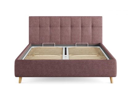 Двуспальная кровать с мягким изголовьем подойдет для современных интерьеров спален, а благодаря высоким деревянным ножкам впишется в стиль ретро, скандинавский или минимализм.