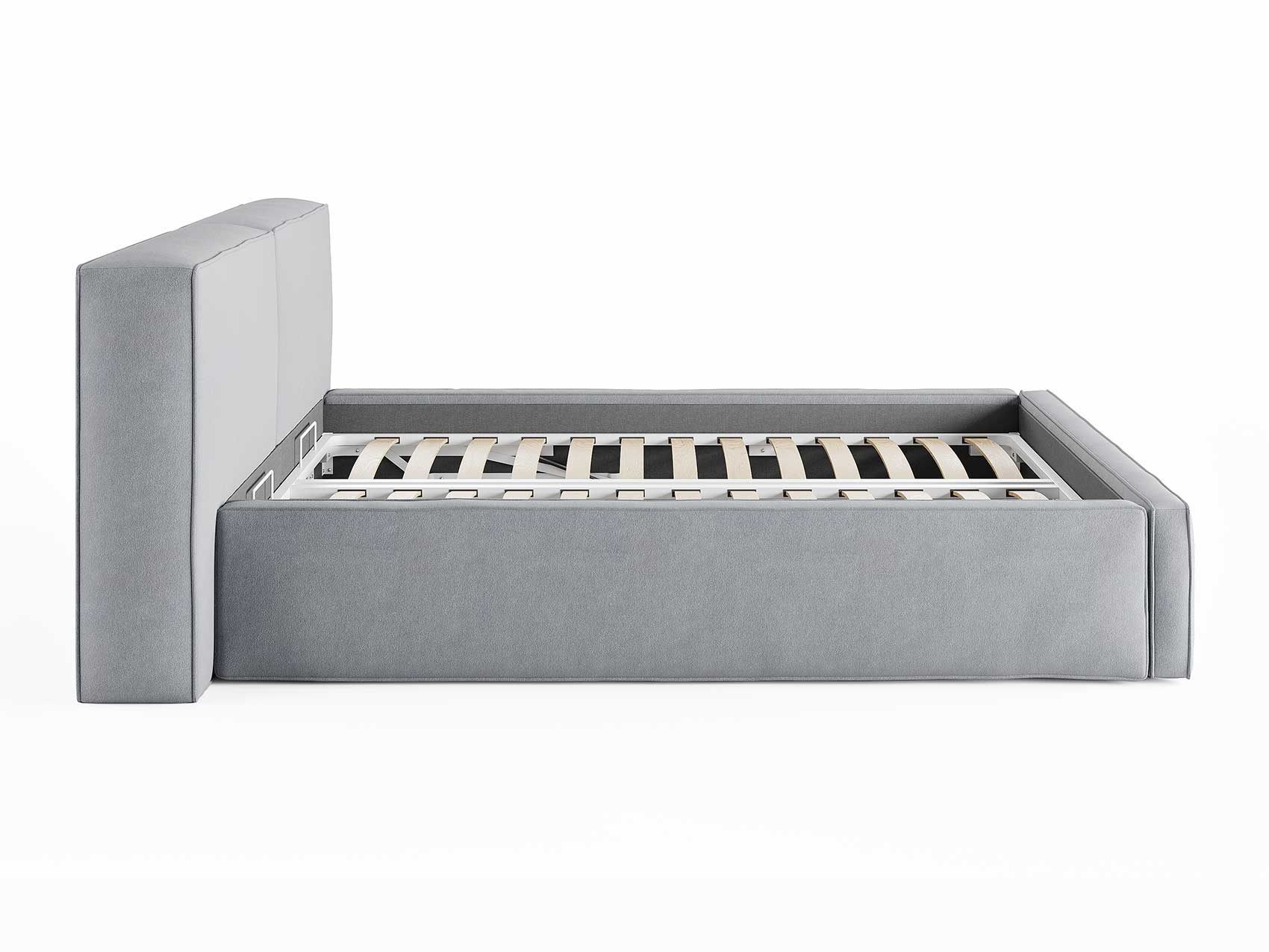 Кровать комплектуется металлическим основанием и подъемным механизмом со вместительным бельевым ящиком. Дно бельевого ящика легко сдвигается для обеспечения уборки под кроватью.