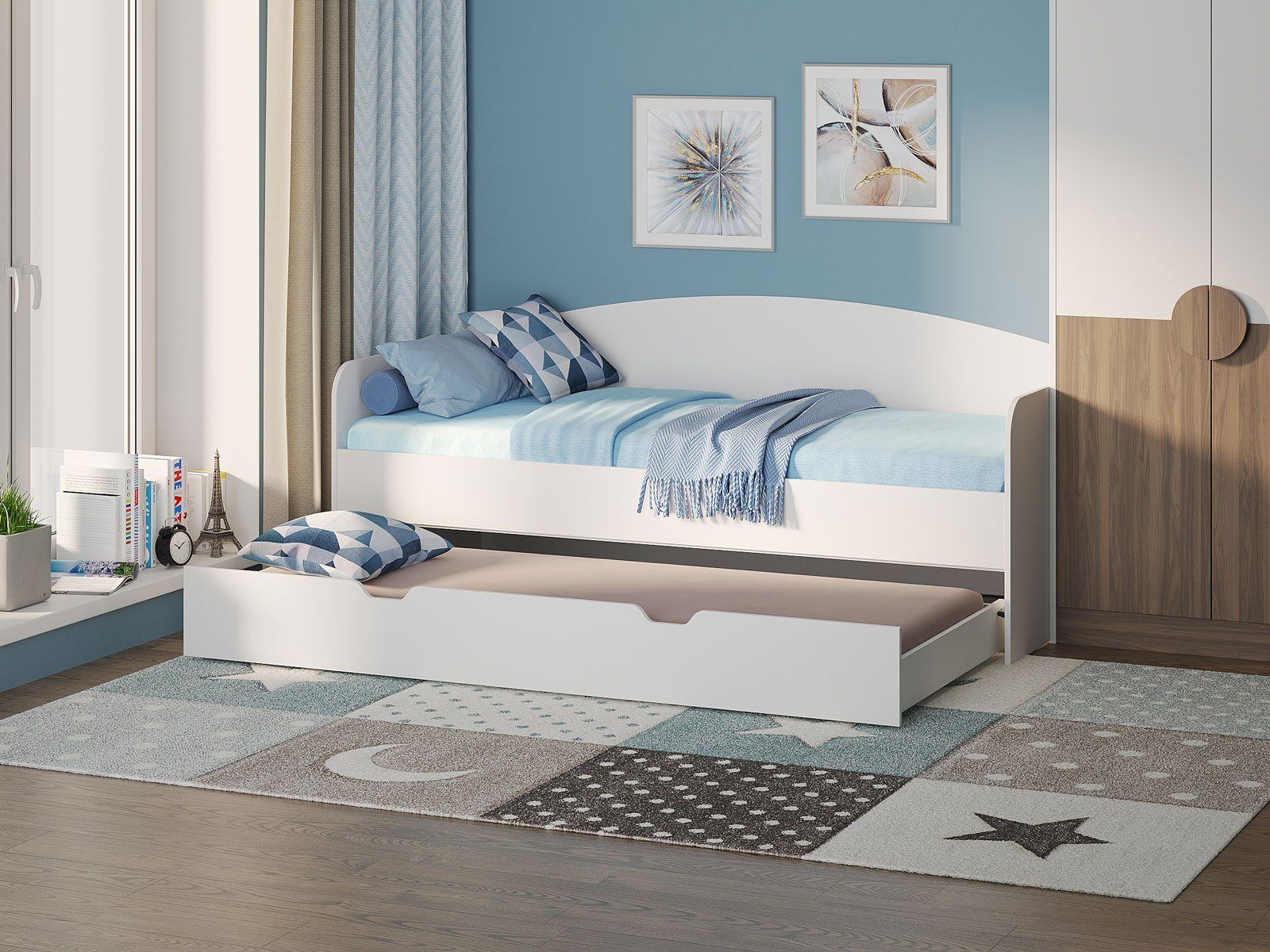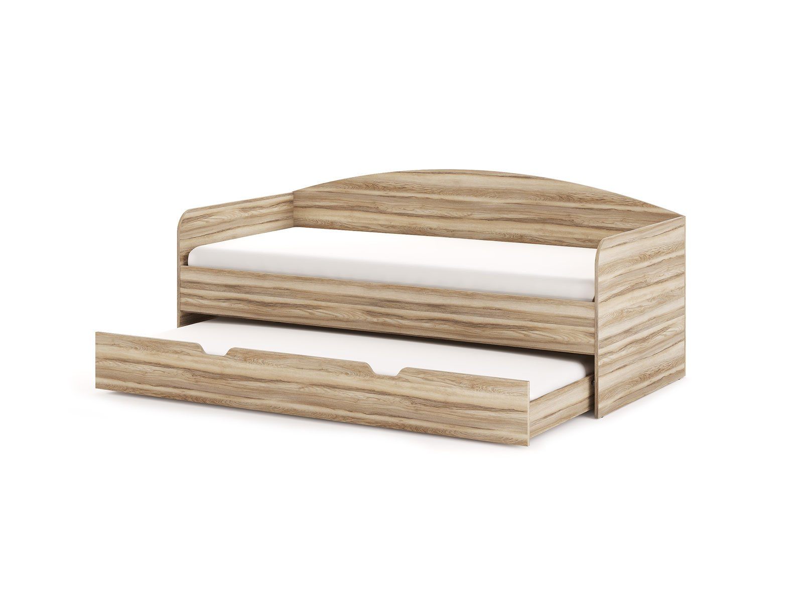 Кровать из ЛДСП с дополнительным выдвижным спальным местом. Выдвижная часть модели может использоваться в качестве дополнительного спального места или вместительного бельевого ящика. Модуль выдвигается с помощью роликов. Возможность полного выдвижения способствует легкой уборке под кроватью. Варианты исполнения: доступна в пяти цветах ЛДСП (белый, графитовый, ясень ориноко, ясмунд и ясень анкор)