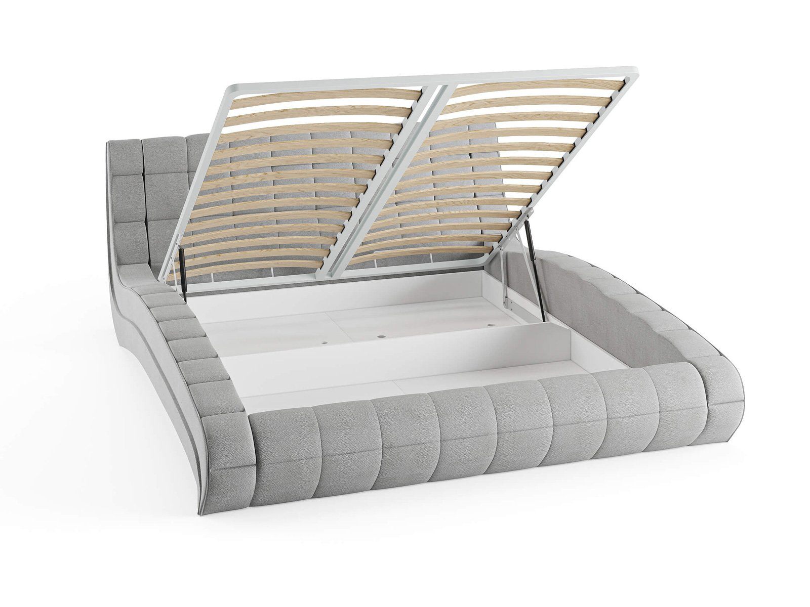 Кровать комплектуется металлическим основанием и подъемным механизмом со вместительным бельевым ящиком. Дно бельевого ящика легко сдвигается для обеспечения уборки под кроватью.