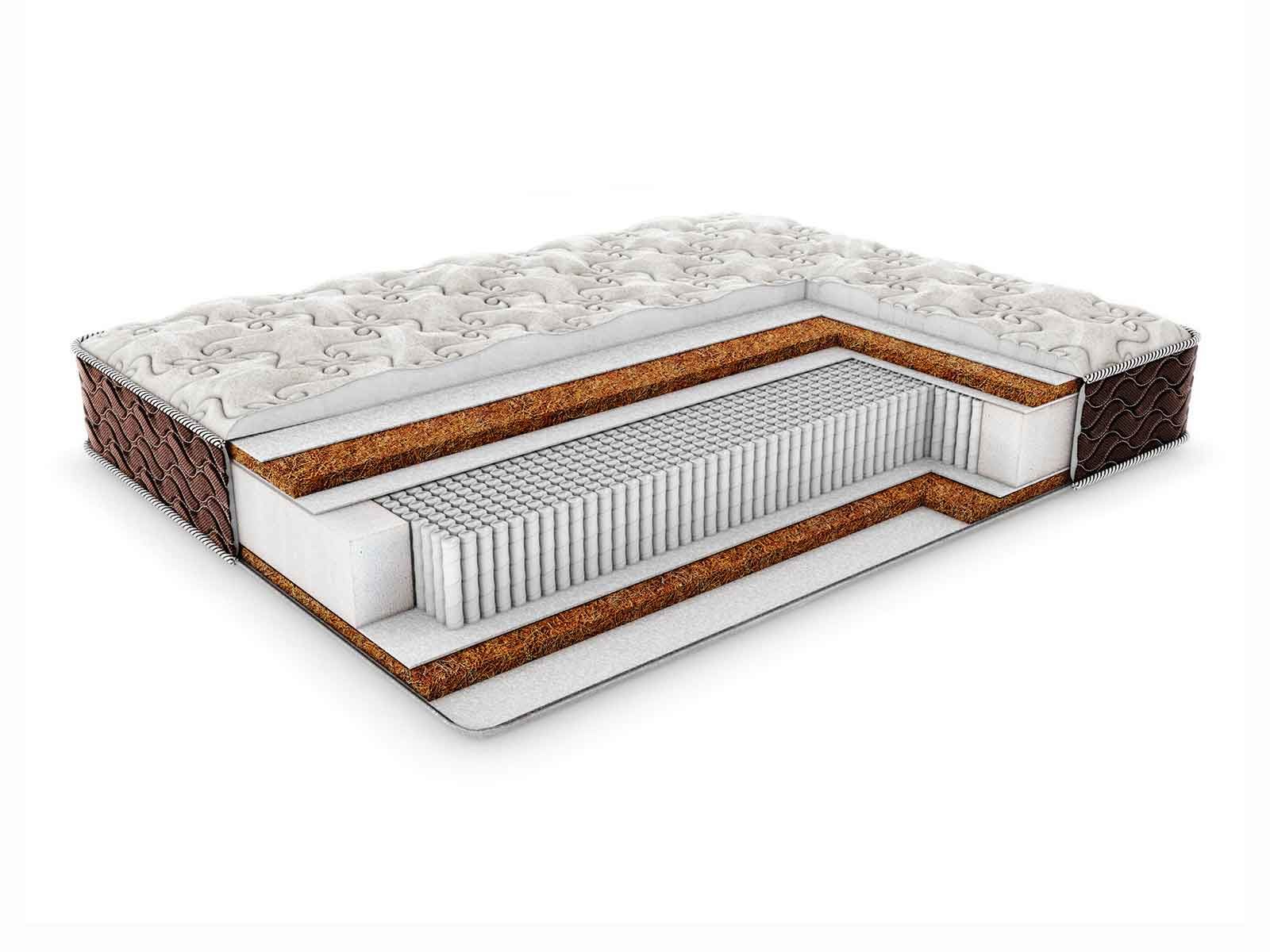 У каждой из поверхностей спальной принадлежности расположился 3 см слой койры кокоса. Данный наполнитель является одним из самым популярных жёстких материалов, поскольку обладает высокой прочностью. Однако более всего он ценим за ортопедические возможности, которые он щедро передаёт спальному месту.