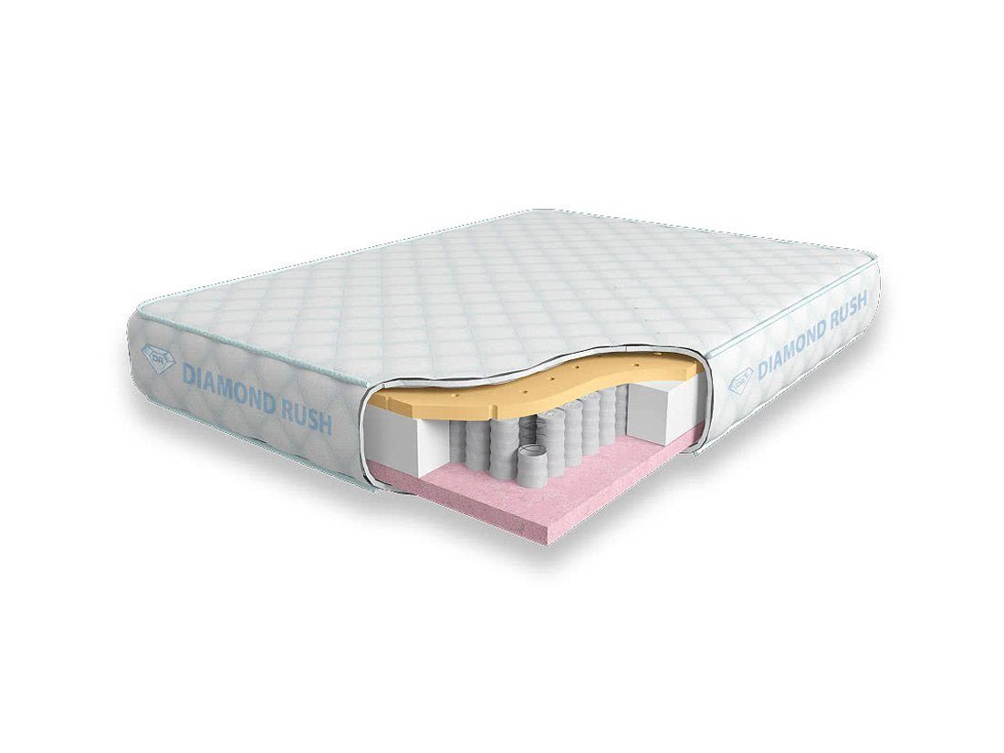 Матрас Diamond Rush Soft Great 725DR имеет в своей основе независимый пружинный блок 725, состоящий из пружин диаметром 5-6 см. В качестве настилочных слоев поверх пружинного блока используются листы натурального латекса с перфорацией и вязкоэластичного Меморикса, обладающего эффектом памяти. Обе стороны матраса являются мягкими.
