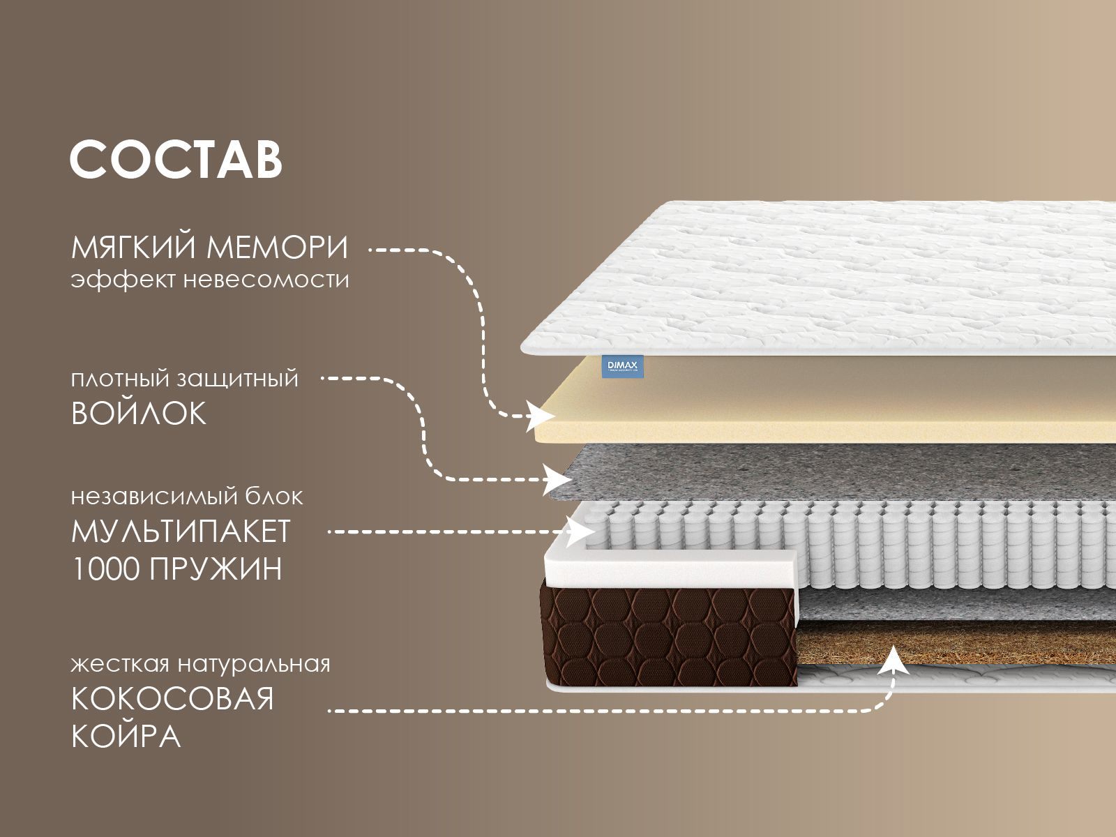 Модель сочетает абсолютный комфорт мягкого Мемори и уверенную твёрдость койры, а усиленный блок независимых пружин бережно поддерживает позвоночник.