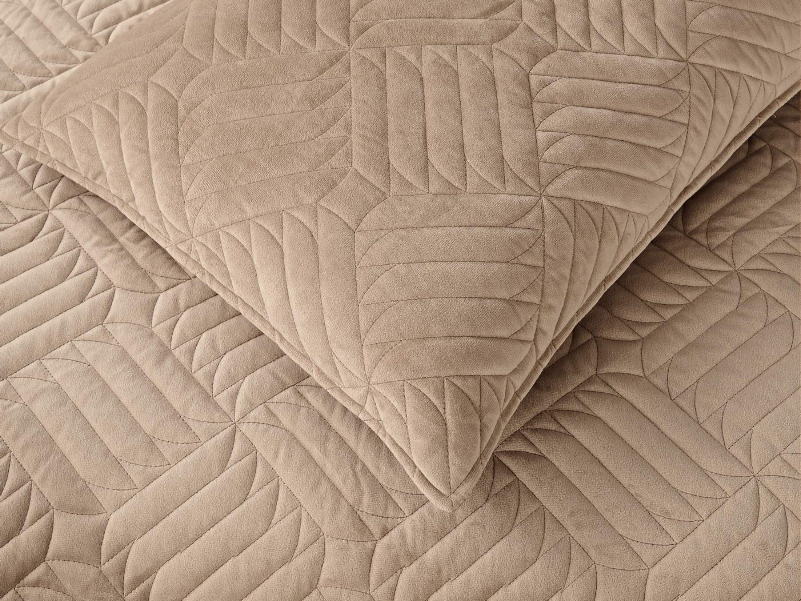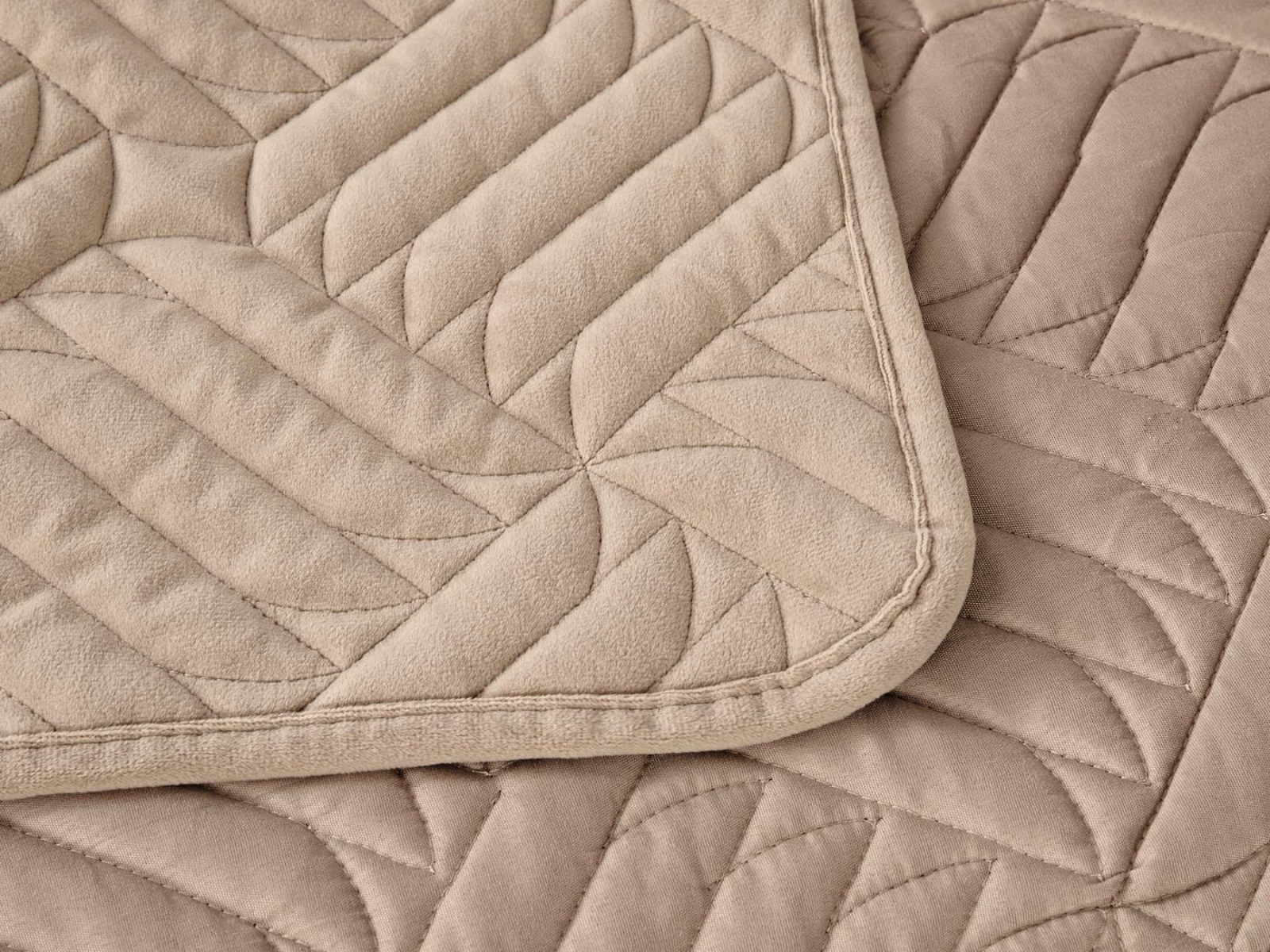 Покрывала выполнены в 10 оттенках: крем, мокко, пепельный, песочный, светло-бежевый, светло-серый, серый, темно-серый, чайная роза и черный. Стежка в виде геометрического орнамента подойдет к любому современному интерьеру. Из-за особого плетения, велюровая ткань покрывала отражает свет и красиво переливается при различном освещении.