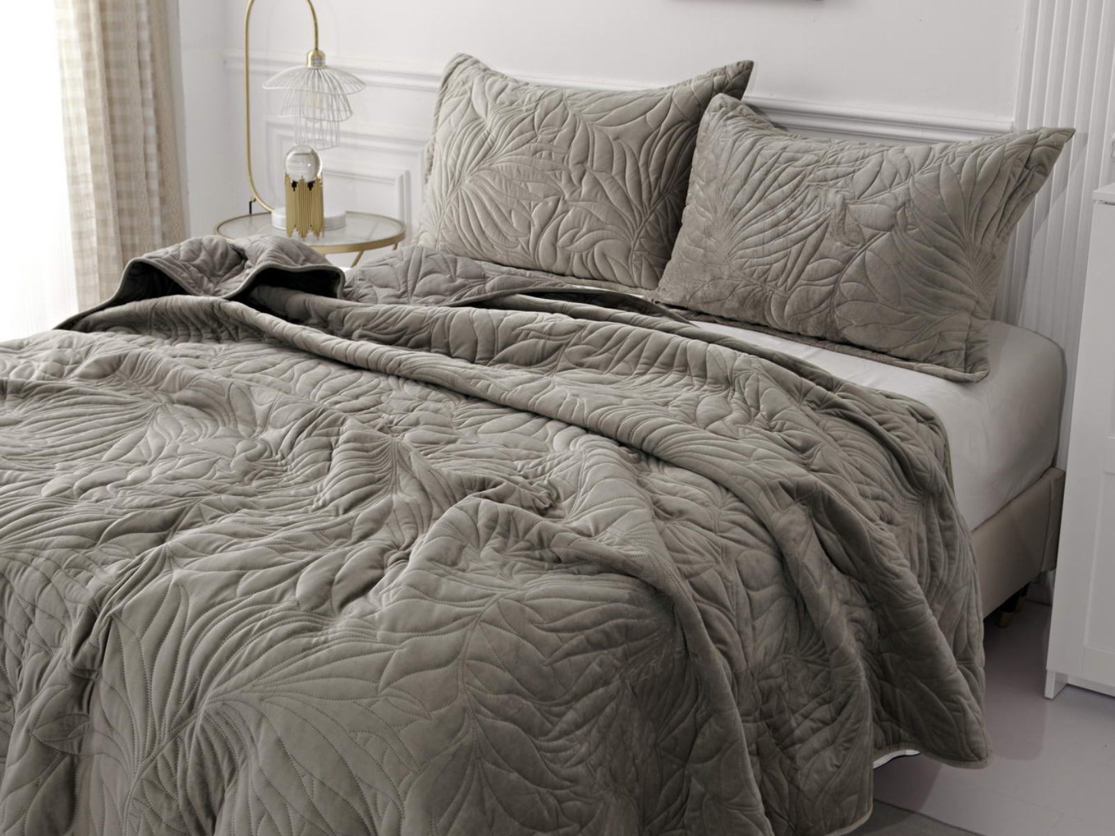 Стёганое покрывало Глория изготовлено из 100% вискозы, что делает его невероятно мягким и комфортным. Рисунок напоминает листья лавра. Такой орнамент подойдет большинству современных интерьеров.