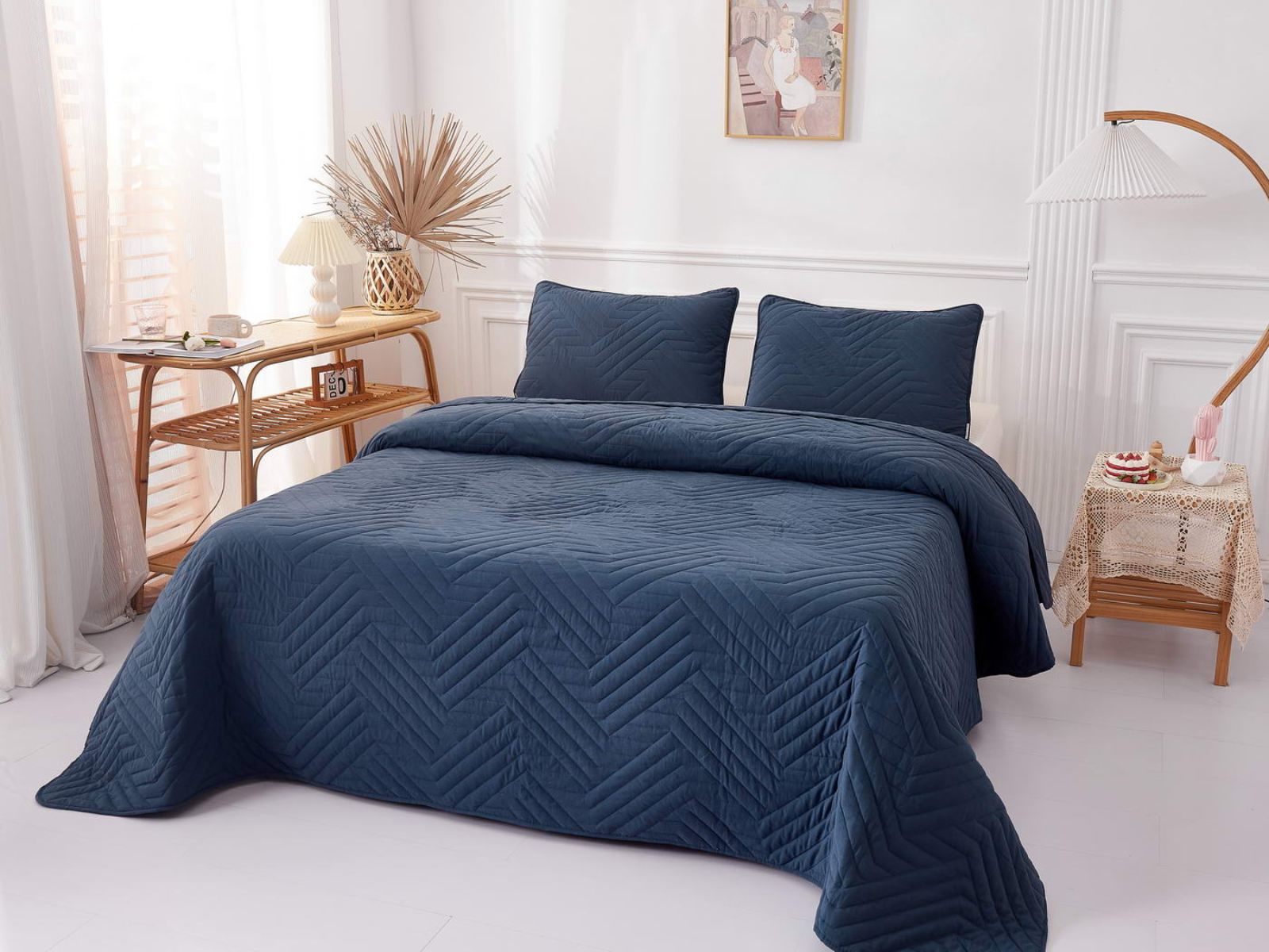 В комплект входят покрывало и одна либо две наволочки (50х70 см) из аналогичного материала в зависимости от размера. Изделия гипоаллергенны, они подходят детям и людям с чувствительной кожей. Покрывала и наволочки не линяют, сохраняют форму и цвет при многочисленных стирках и не выгорают на солнце. Изделия можно стирать в щадящем режиме при температуре не выше 30 градусов.